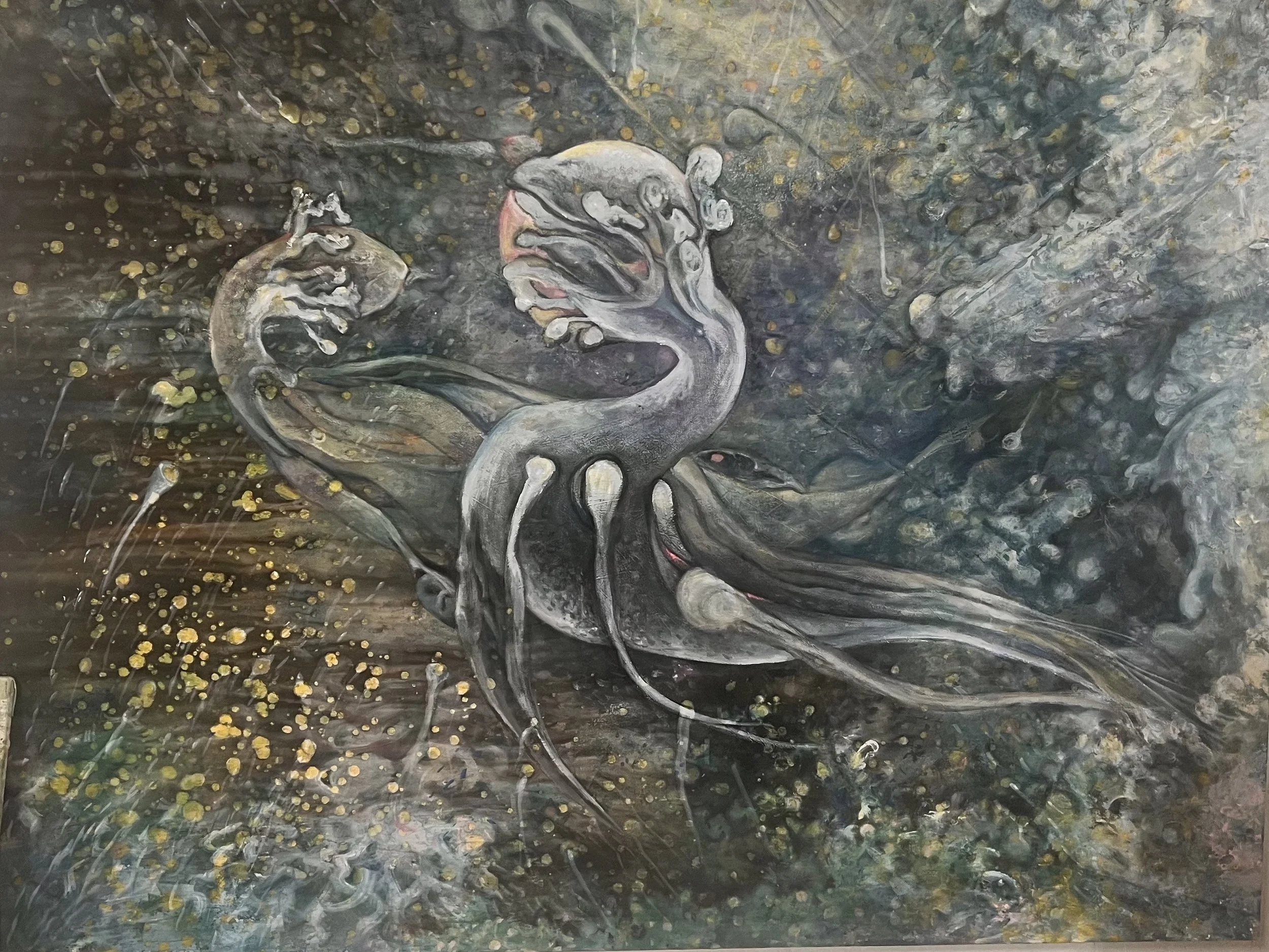 Manchmal ist es die geliebte Erde – aus der Vogelperspektive als wirbelnde Wolke, als Spiegelung im Wasser. Dann wieder ein Sternennebel, ein Blick in Sphären und Äther. Es sind offene, vielschichtige, oft flüchtige Überlagerungen – fließende Strudel, blubbernde Kosmen.
